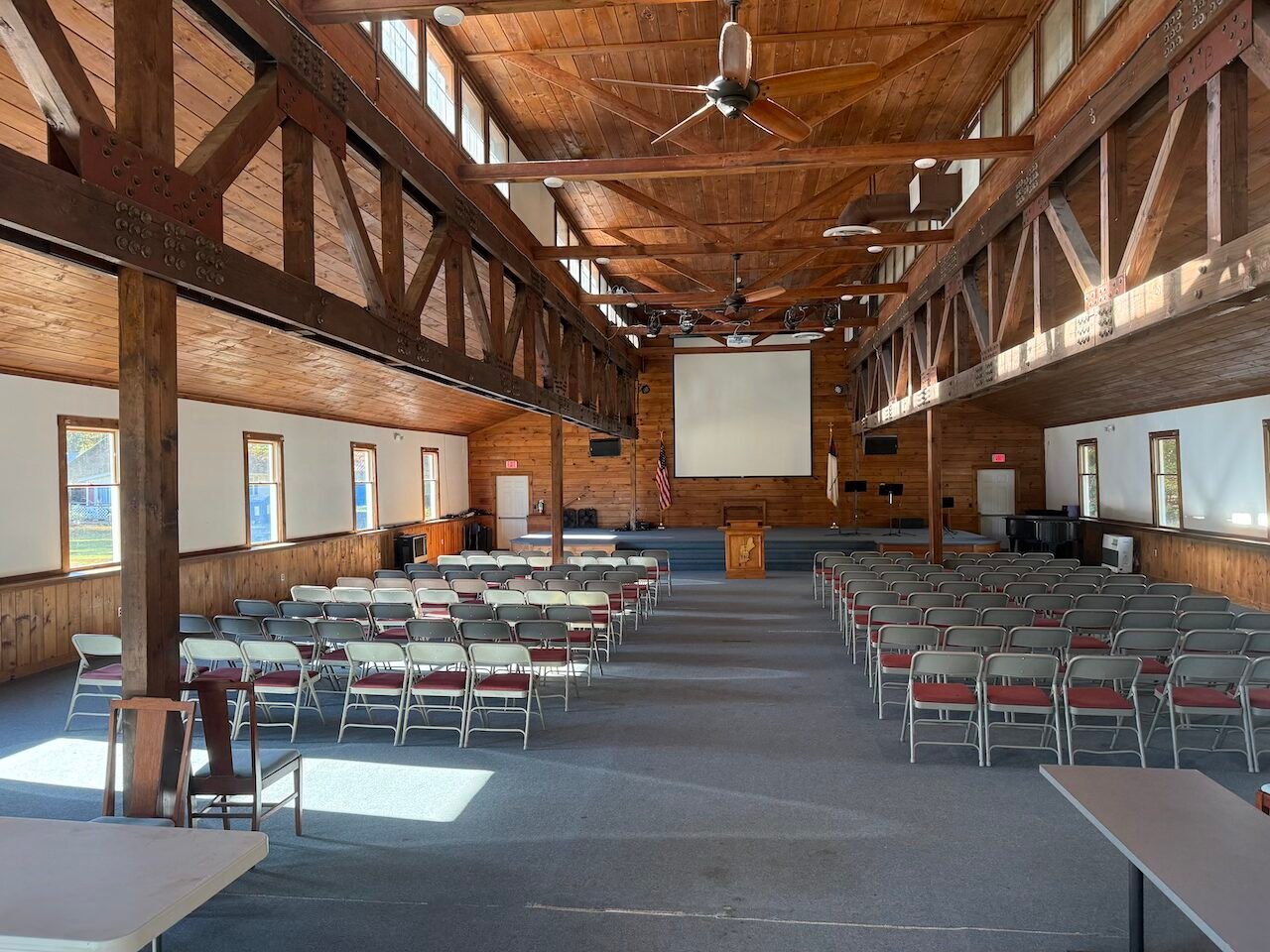 - Seats 300, platform, sound system, projector, restrooms, mic and music stands